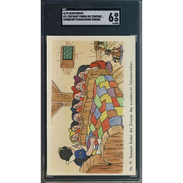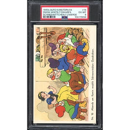 The 1940 Alfo Kunstdruck Snow White cards are a rare and visually striking set of collectible prints or trading cards produced in Germany by the publisher Alfo Kunstdruck. These items were released a few years after the 1937 premiere of Walt Disney’s Snow White and the Seven Dwarfs, and are among the earliest examples of Disney-themed collectibles in Europe. Typically issued as postcard-sized prints or small-format lithographic cards. The cards are high-quality color lithographs with detailed scenes from the film. Rich colors and finely printed—"Kunstdruck" means "art print" in German, indicating premium print quality. Characters include Snow White, the Evil Queen, the Seven Dwarfs, the Prince, the Magic Mirror, and iconic forest animals. The card backs were usually blank or printed with basic information (in German); some versions may include captions or numbers for collecting.